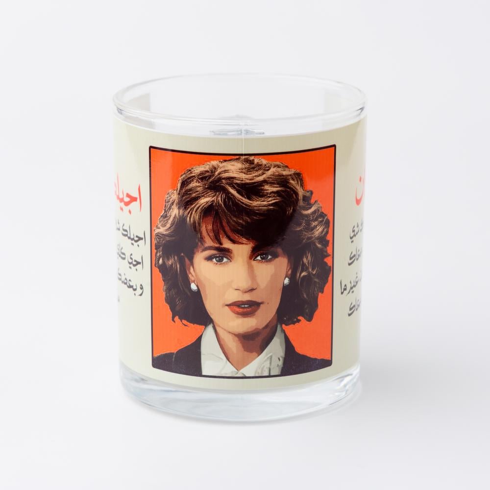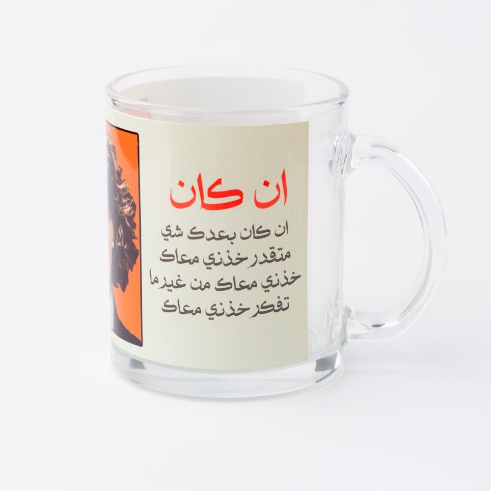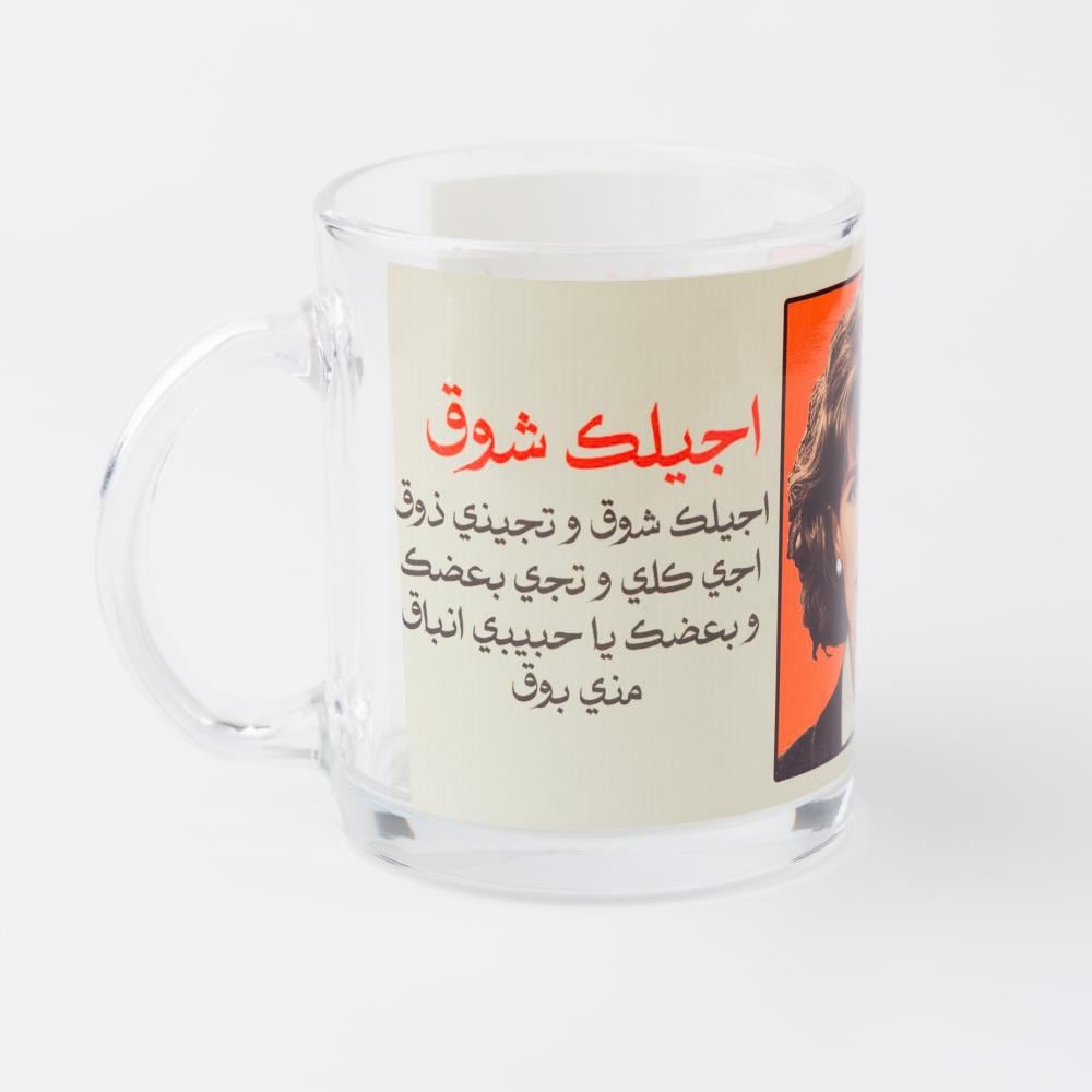 كُوب مطبوع عليه أغنيتين من أعذب أغاني ذكرى " وحياتي عندك " و " أجي لك شوق "